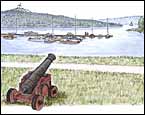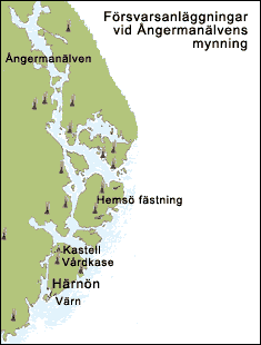 på Vårdkasberget. På kvällen den 29 maj 1721 flammade vårdkasen upp. Härnösandsborna flydde brådstörtat från staden och den ryska galärflottan med 82 fartyg och 7500 man brände hela Härnösands stad och dessutom nära 300 gårdar i södra Ångermanland. Ångermanälvens djupa mynningsvik med dess utmärkta hamnar, stora industrier och sårbara broar fick under 1900-talet allt större strategisk betydelse. Under världskrigen och det kalla krigets dagar byggdes omfattande befästningsverk på öarna och fastlandet kring älvens utlopp som skydd för anfall från havet. I dagens fredliga tider avvecklas de allt eftersom. |