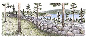 | Värn Längs infarten till Södra sundet finns ett flertal värn i form av långa murar av stenblock. Det är oklart när de är byggda, men de kan ha varit avsedda att skydda sundet mot en fientlig flotta. |